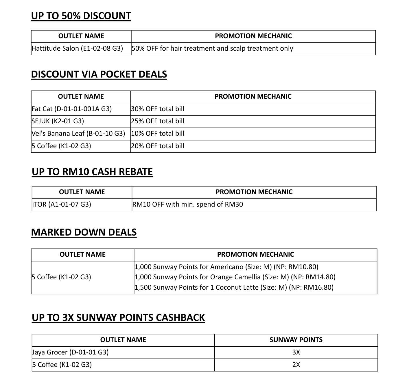 For specific terms and conditions of individual deals, kindly visit the respective merchant outlets and refer to their staff to find out more.